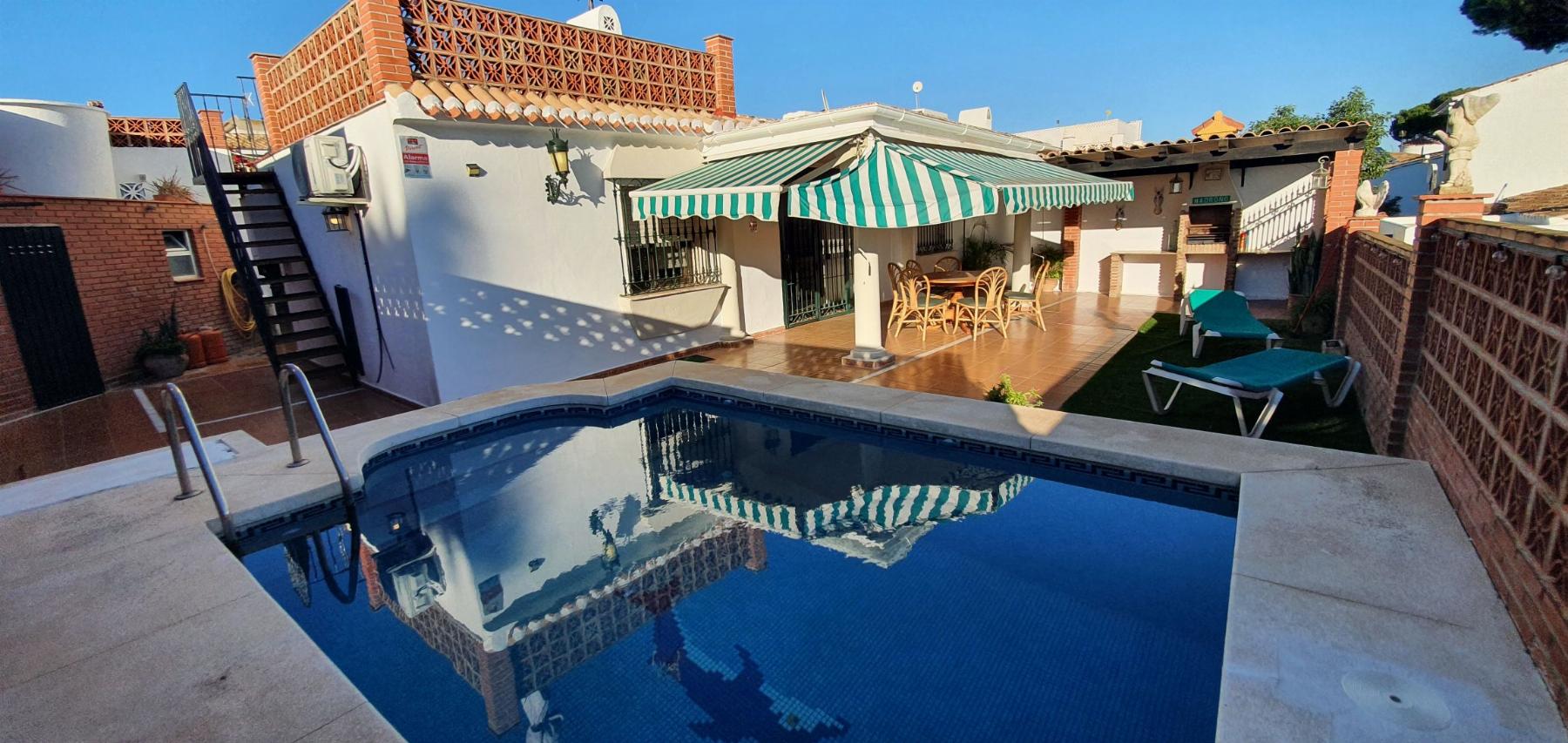 Chalet in Urb Calypso de Mijas, with 110 m² built, 271 m² plot sq.meters, 3 bedrooms, 2 bathrooms, good condition, outward, 3 terraces, 60 m² of terrace, kitchen independent, storage room, furnished, orientation southwest, 1960, private pool, 1 floors, air conditioner cold/hot, balcony